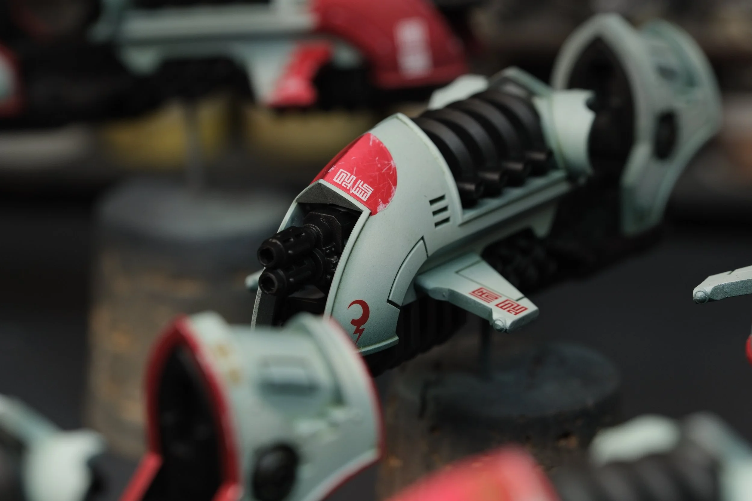 Currently, I've made some changes to the painting process that is making this much more time-efficient. The drawing and cutting of small strips of tamiya masking tape is really helping to make the red markings on the jetbikes. By overlaying the template and lightly tracing it with an HP pencil, I can easily go in with a brush and paint the patterns of the sawtooth and circles. Removing a lot of the sketching and concentration of getting even spacing. Cutting each pattern to be done in over half the time. I've also added light scratches within the red to create some textured noise as well as ivory chips to make some edges worn. Covering a few small errors made and throughout the rest to create some interest as well. This leads into the white and a change in the scheme in that I'll be adding a little bit of weathering into the white with chipping, but nothing heavy with deep grime or any sort of oil wash. I still very much want to keep the scheme clean and a creative concept change of the off-white/green. Initially this was more done in the idea of atmosphere and rebounding of the green base. Instead I've changed this perspective in that the armour is of a very light Jade, something I've referenced from my Majong blocks. This new perspective was very helpful and key to putting my mind more at ease when I think about painting warmachines and tanks, units which are typically not mounted on any base. Simplifying the white in this manner and not fussing about enamel washes on the white which honestly is a pain in the ass to get right is the best move I've made. Leading back and giving the strong volume work and details with the red elements is where most of the attention really goes into, and for an army thats going to be good enough.