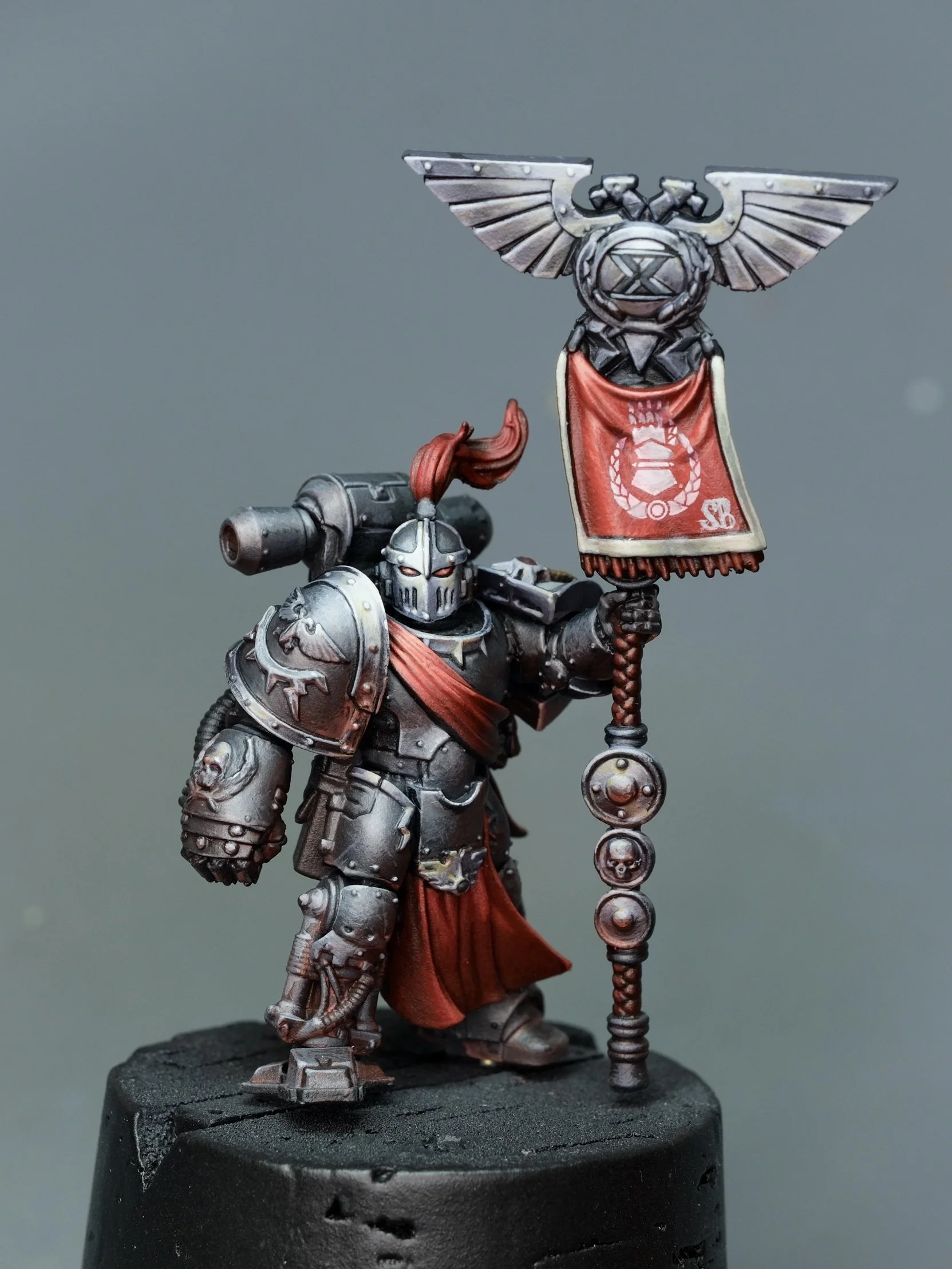 The Space Marine next is a new Iron Hands Herald that I've started the next day, and will be a wedding gift from the bride-to-be! It's always an interesting challenge to paint a legion with a real lack of colour, but grabbing a spot colour and really leaning into the values with the right lighting can make all the difference. As for you tutorial lovers out there, I'm sorry, but this piece hasn't been under the video camera. I do have another Iron Hands tutorial on painting black power armour in the Space Marines Collection for you all to view, which was also painted for the same friend (Yes, he's a die-hard Iron Hands player!)